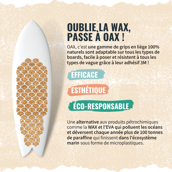 Nous sommes en 2022, et nous mettons encore de la paraffine “wax” sur nos planches de surf pour ne pas glisser. Malheureusement, la wax à un côté sombre, elle pollue nos océans. En effet, la cire qui est appliquée à chaque session, finit par se dégrader et migre dans l’écosystème marin. OAX SURF est né à Nantes à partir de ce constat. Nous proposons une alternative en liège et autoadhésive et qui permet aux surfeurs/es de ne plus “waxer” ou cirer une planche de surf. Une solution à la fois efficace, esthétique et éco responsable. Le sport, le bien-être et la nature sont les carburants d’OAX SURF. Des engagements portés par de fortes valeurs écologiques pour un surf plus écoresponsable. Nous fabriquons et distribuons aujourd’hui nos produits en Loire Atlantique.